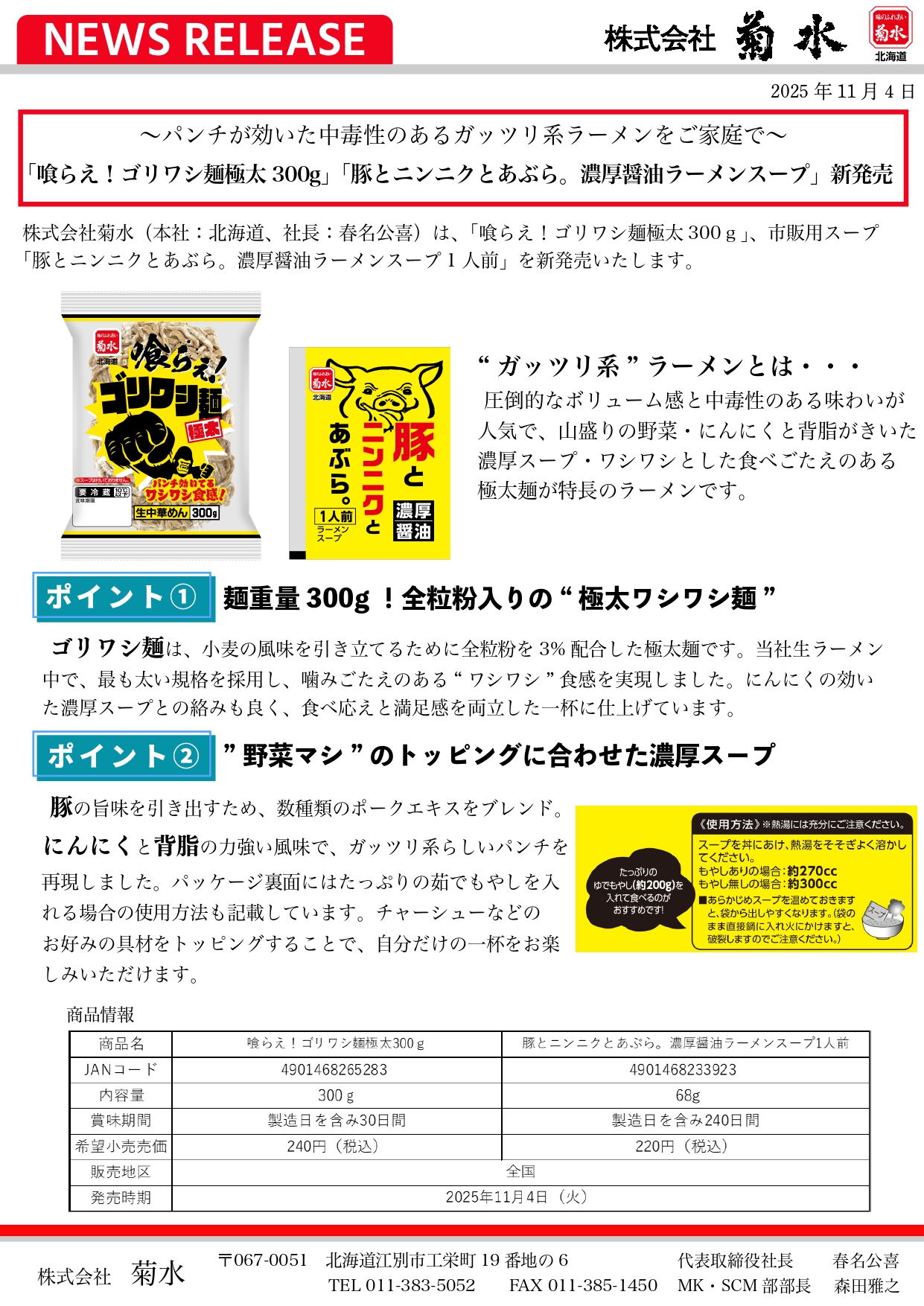 株式会社菊水(本社:北海道、社長:春名公喜)は、「喰らえ!ゴリワシ麺極太 300g」「豚とニンニクとあぶら。濃厚醤油ラーメンスープ」を新発売いたします。 PDFダウンロード