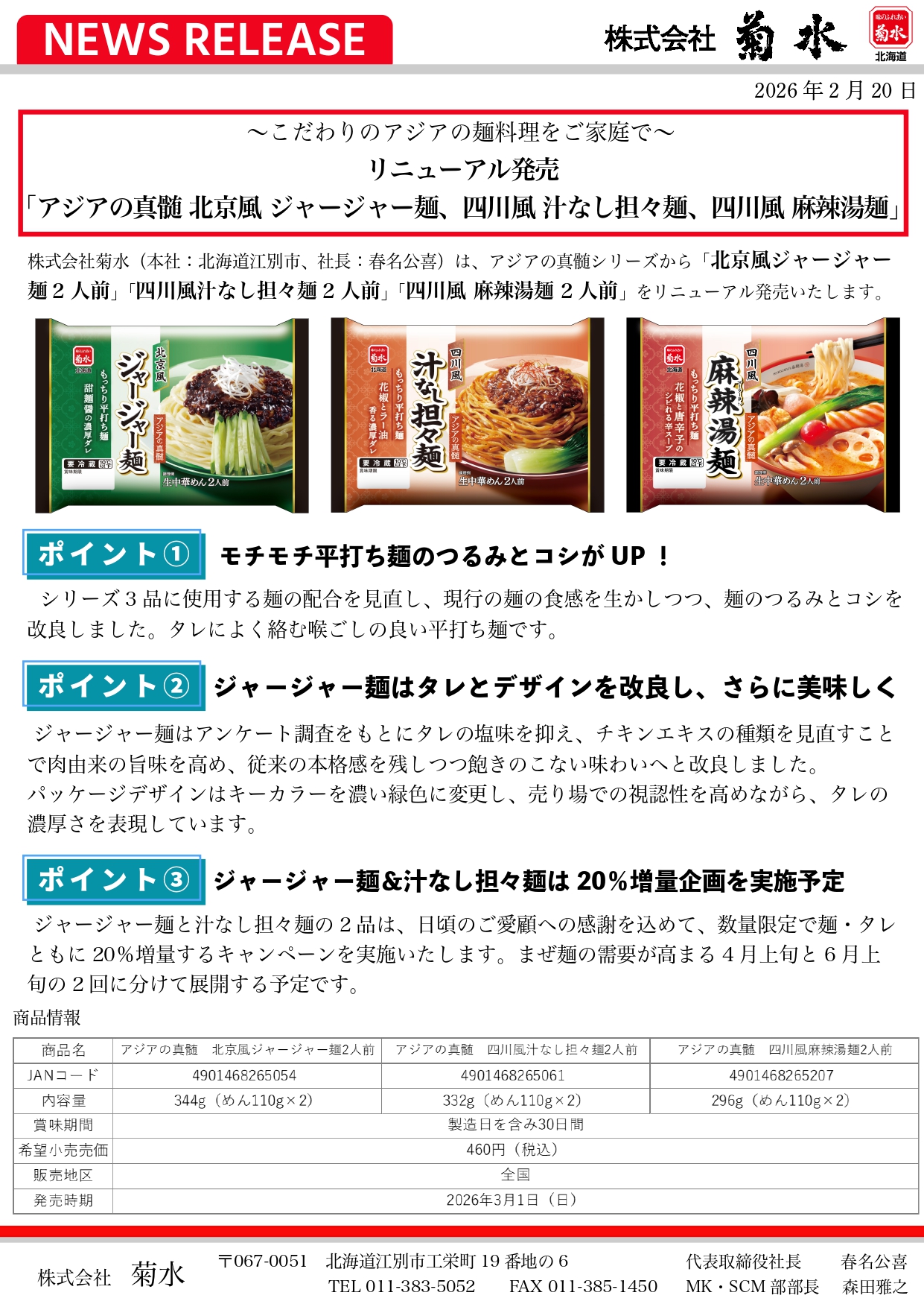 株式会社菊水(本社:北海道江別市、社長:春名公喜)は、アジアの真髄シリーズから「北京風ジャージャー麺2人前」「 四川風汁なし担々麺2人前」「 四川風 麻辣湯麺 2人前」をリニューアル発売いたします。